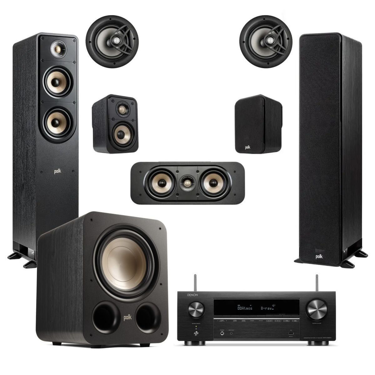 Great Sound For All • Featuring Hi-Res audio certification • 5.1.2 Dolby Atmos / DTS:X Surround Sound • Polk Signature Elite Series & Vanishing V Series speakers • 10" Active subwoofer with optional upgrade • Denon AV Receiver with HEOS & 8K Pass-through