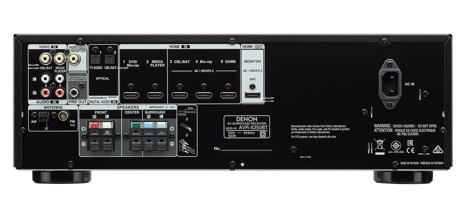 AVR-X250BT5.1 Ch. 4K Ultra HD AV Receiver with Bluetooth At 130W of power per channel, the 5.1 channel Denon AVR-X250BT AV receiver powers quality home theatre that's accessible to everyone. Watch your favourite shows with Full 4K Ultra HD and easily connect your media components and gaming systems to the five available HDMI inputs - or stream music with built-in Bluetooth. Part of the Denon X- Series line-up, the AVR-X250BT AV receiver power quality home theatre at 130W per channel. Enjoy your favourite movies and shows with Full 4K Ultra HD, Dolby True HD and DTS-HD on all five HDMI inputs, and HDCP 2.2 support on the three inputs